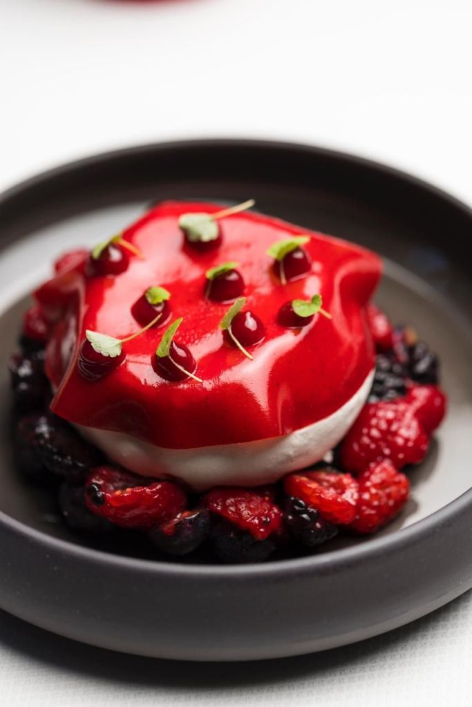 - Garnish with the tiny dots of raspberry coulis and micro mint leaved.