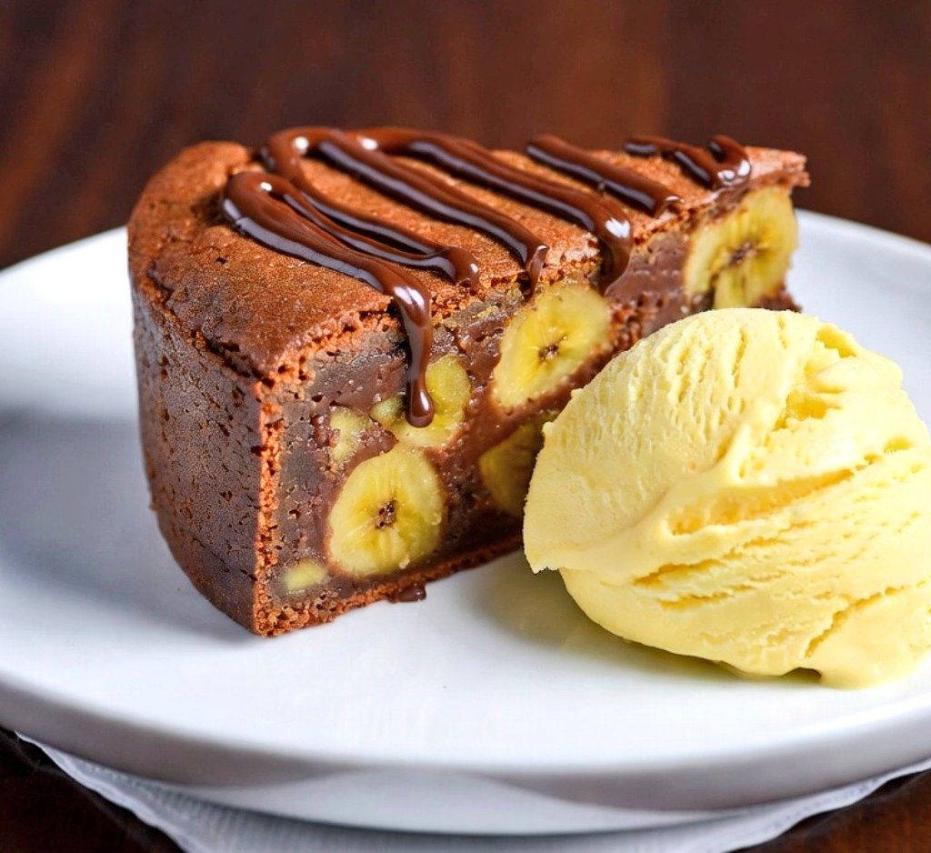 Elegant Banana Chocolate Cake with Banana Ice Cream. This recipe recreates the beautiful dessert from the image: a rich, fudgy chocolate cake studded with caramelized banana slices, finished with glossy chocolate drizzle, and paired with a creamy scoop of homemade banana ice cream. It’s decadent yet surprisingly simple, perfect for an elegant dinner party. The cake has a dense, brownie-like texture with visible banana pieces inside, just like the photo.